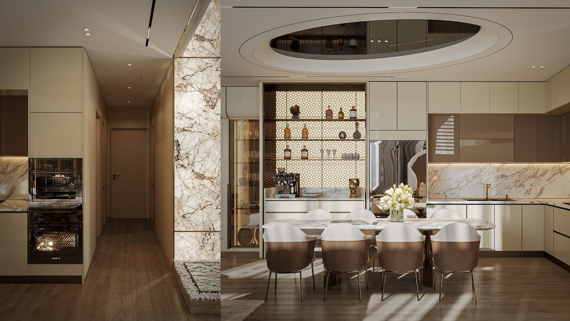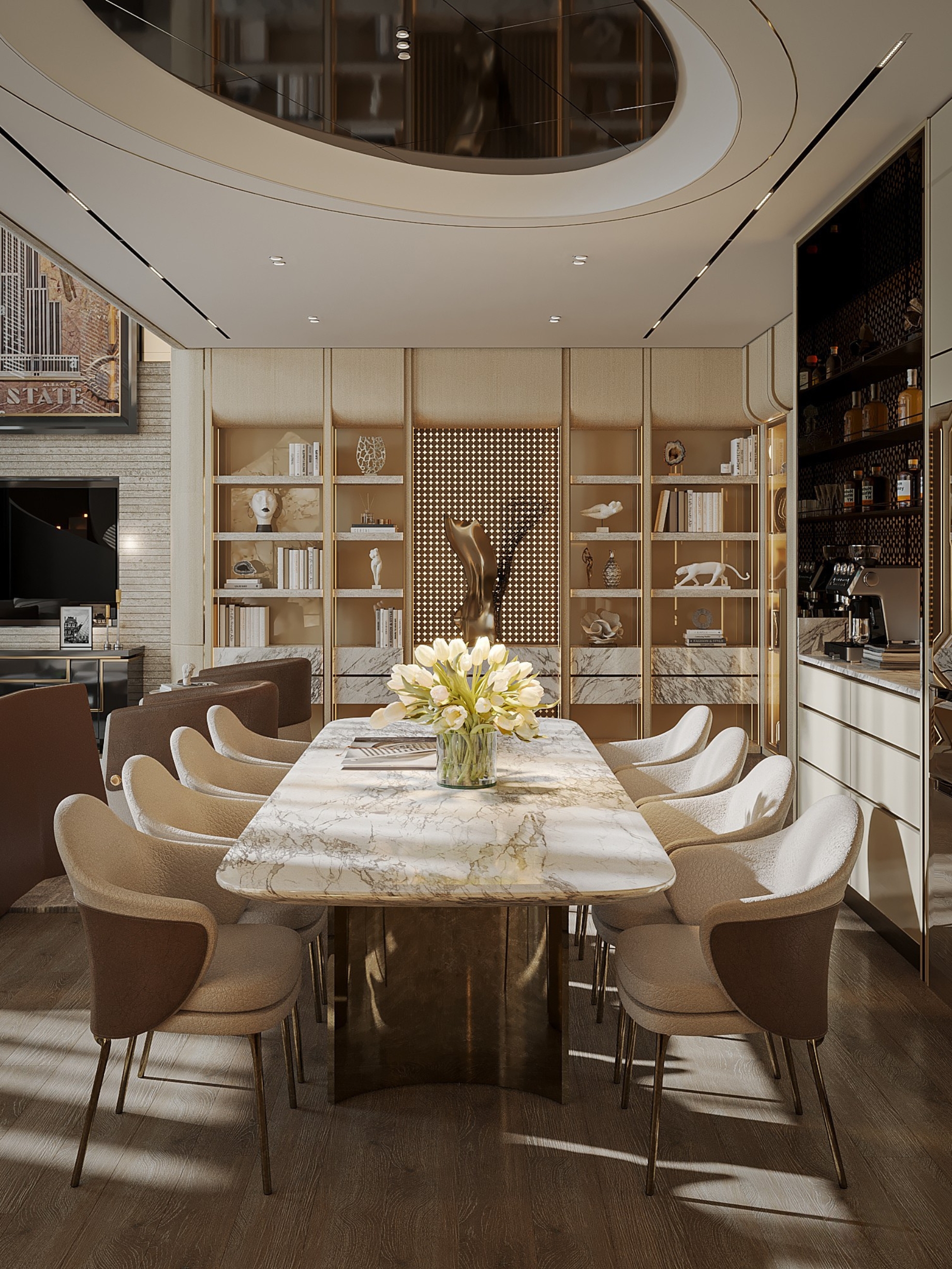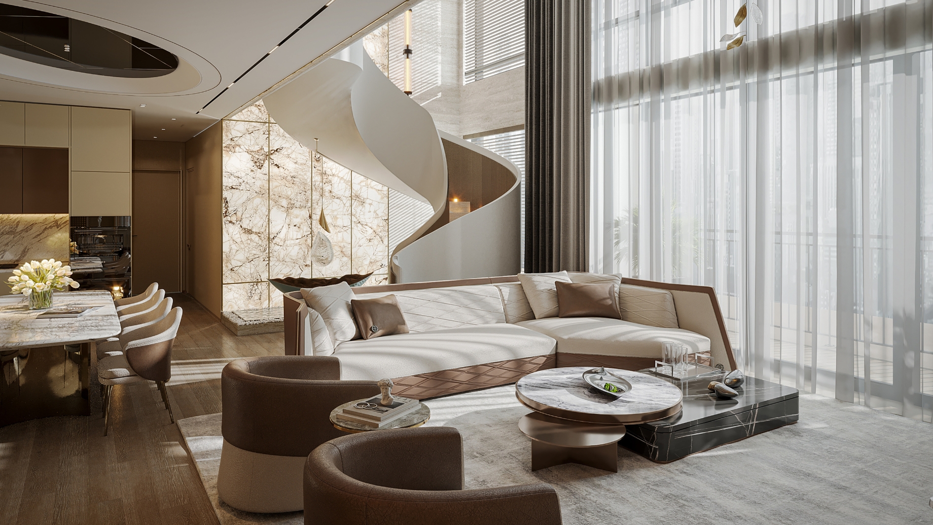 The spiral staircase, sculpted in cloud-patterned stone, brings a touch of artistry to the space. Natural light flows across the marble surfaces and soft beige tones, revealing the care behind every design detail. Each room connects seamlessly, creating a calm rhythm throughout the home.