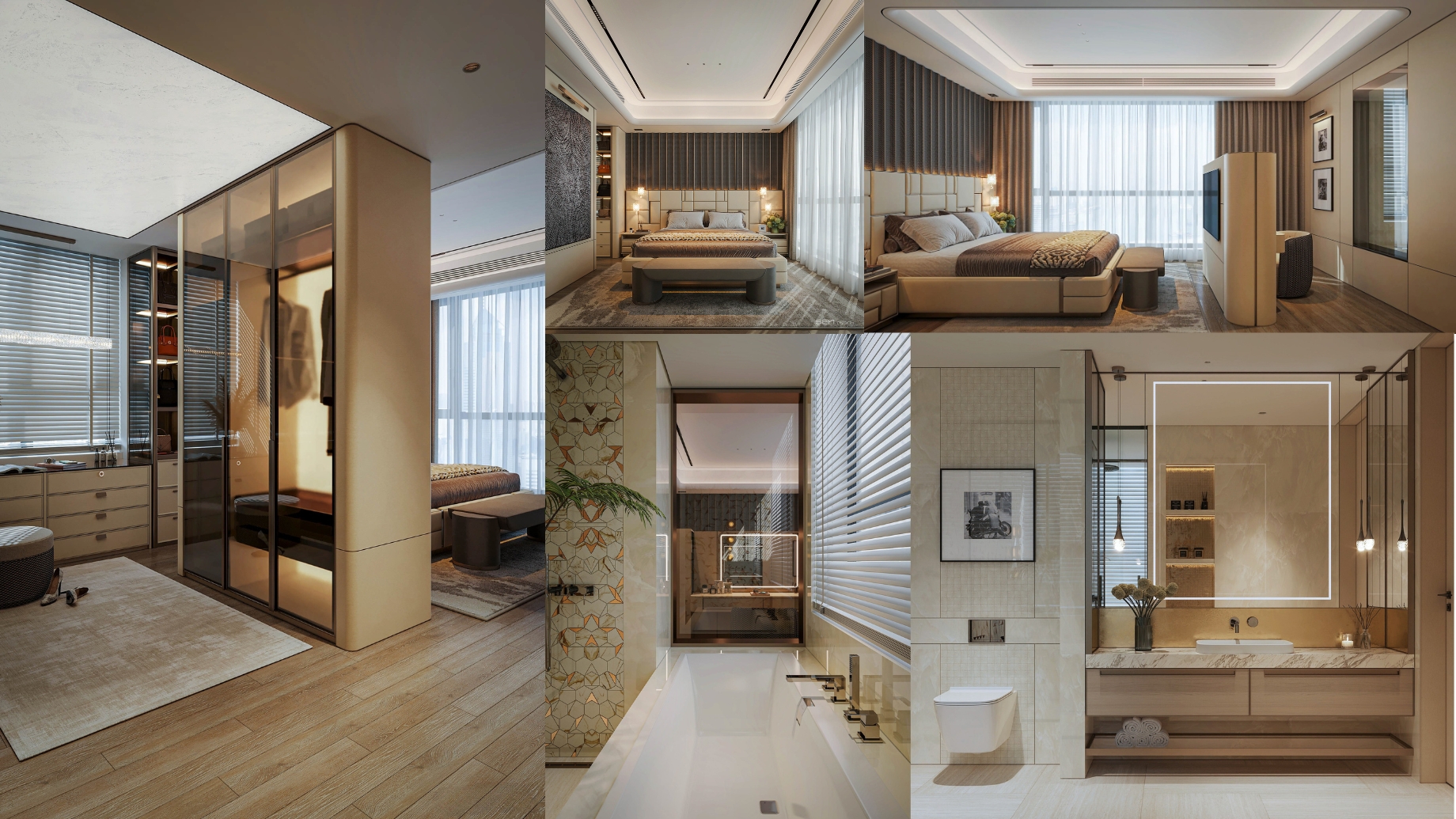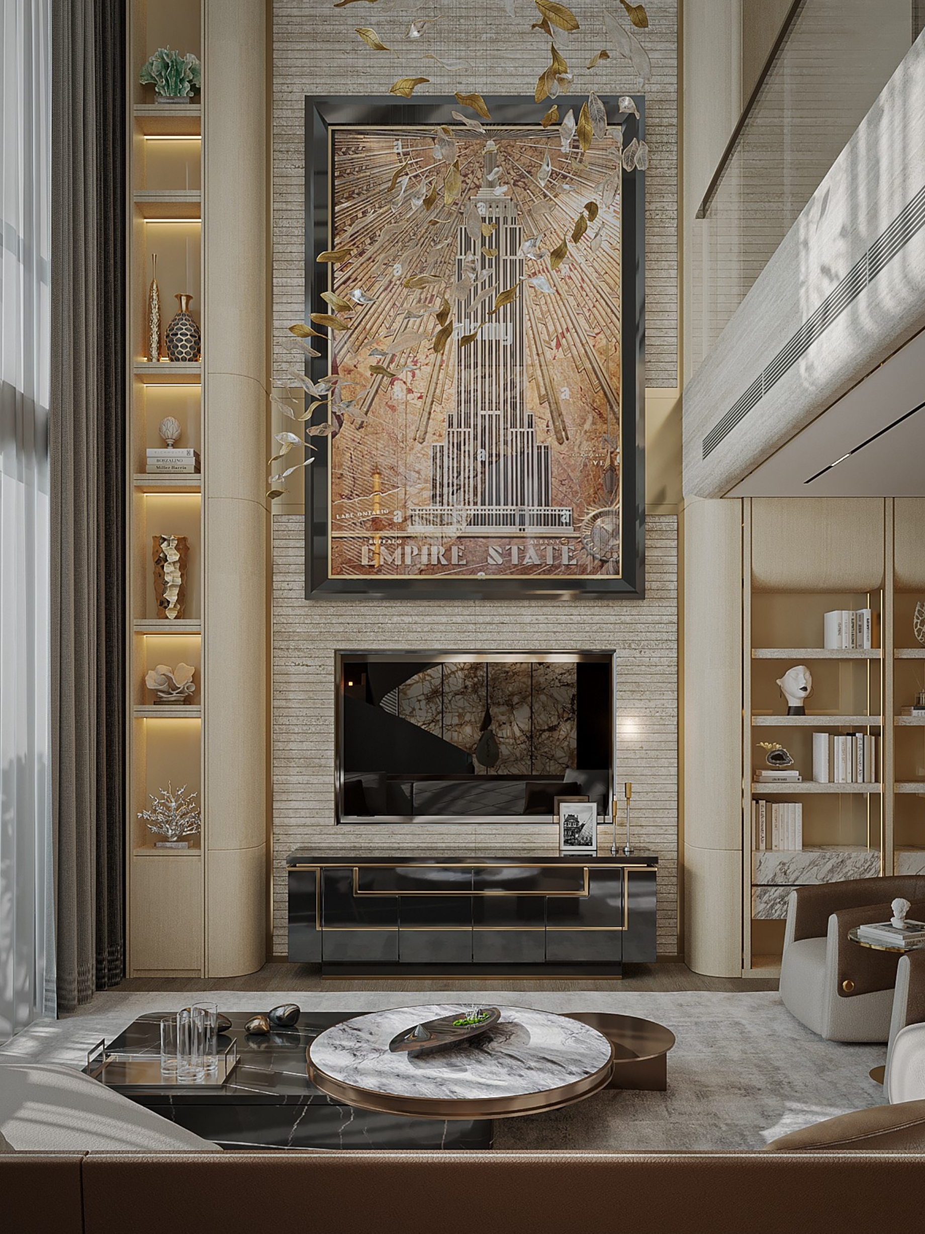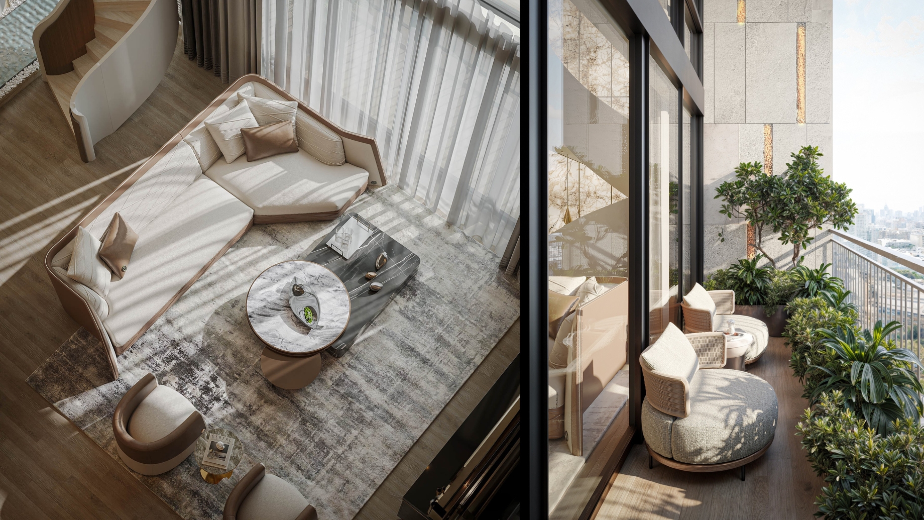 The spiral staircase, sculpted in cloud-patterned stone, brings a touch of artistry to the space. Natural light flows across the marble surfaces and soft beige tones, revealing the care behind every design detail. Each room connects seamlessly, creating a calm rhythm throughout the home.