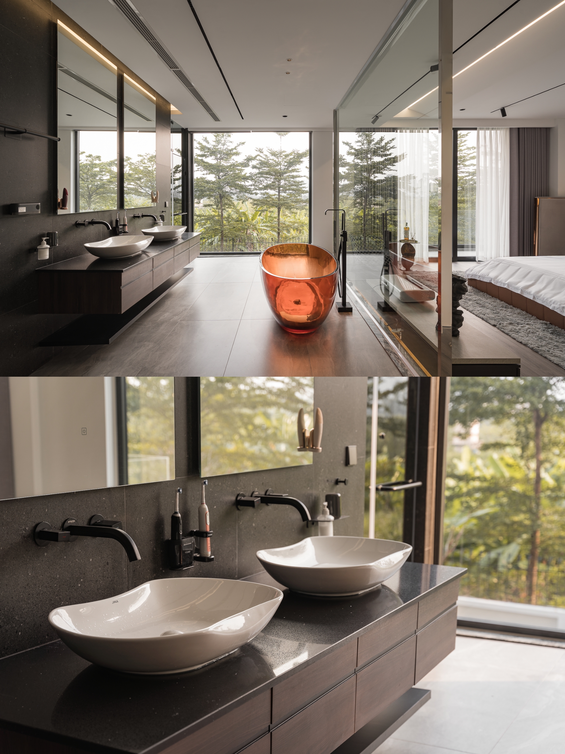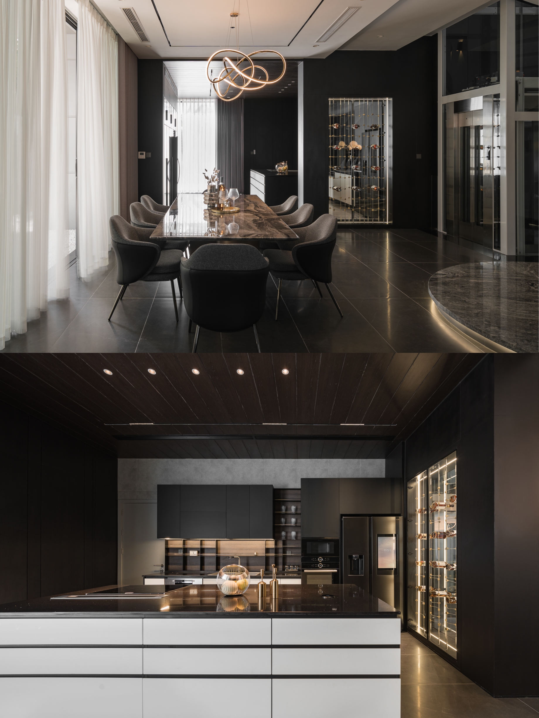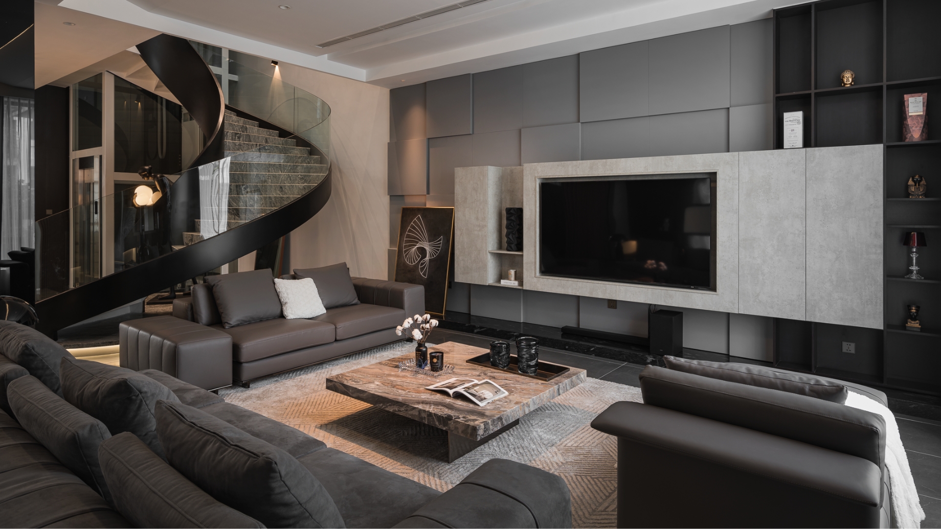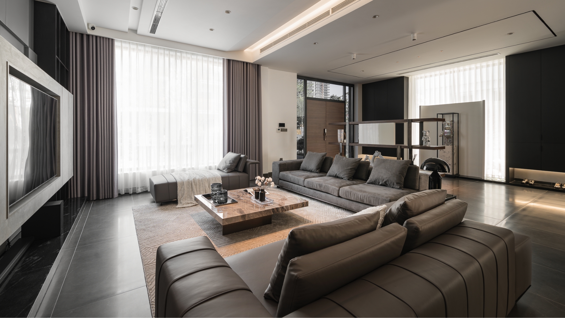 Không gian sinh hoạt chung được xử lý với tông ghi – đen làm chủ đạo, điểm xuyết bởi mặt bàn đá nâu vân ấm, cùng hệ sofa da rộng rãi tạo nên sự cân bằng giữa hiện đại và gần gũi. Phòng khách mở ra khung cửa kính lớn, đưa ánh sáng tự nhiên ùa vào, làm dịu bớt gam màu tối, đồng thời nhấn mạnh tính kết nối giữa nội thất và cảnh quan bên ngoài.