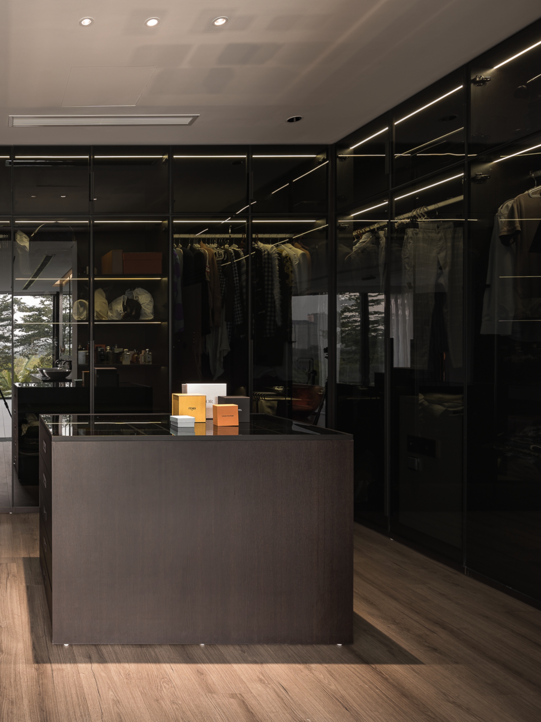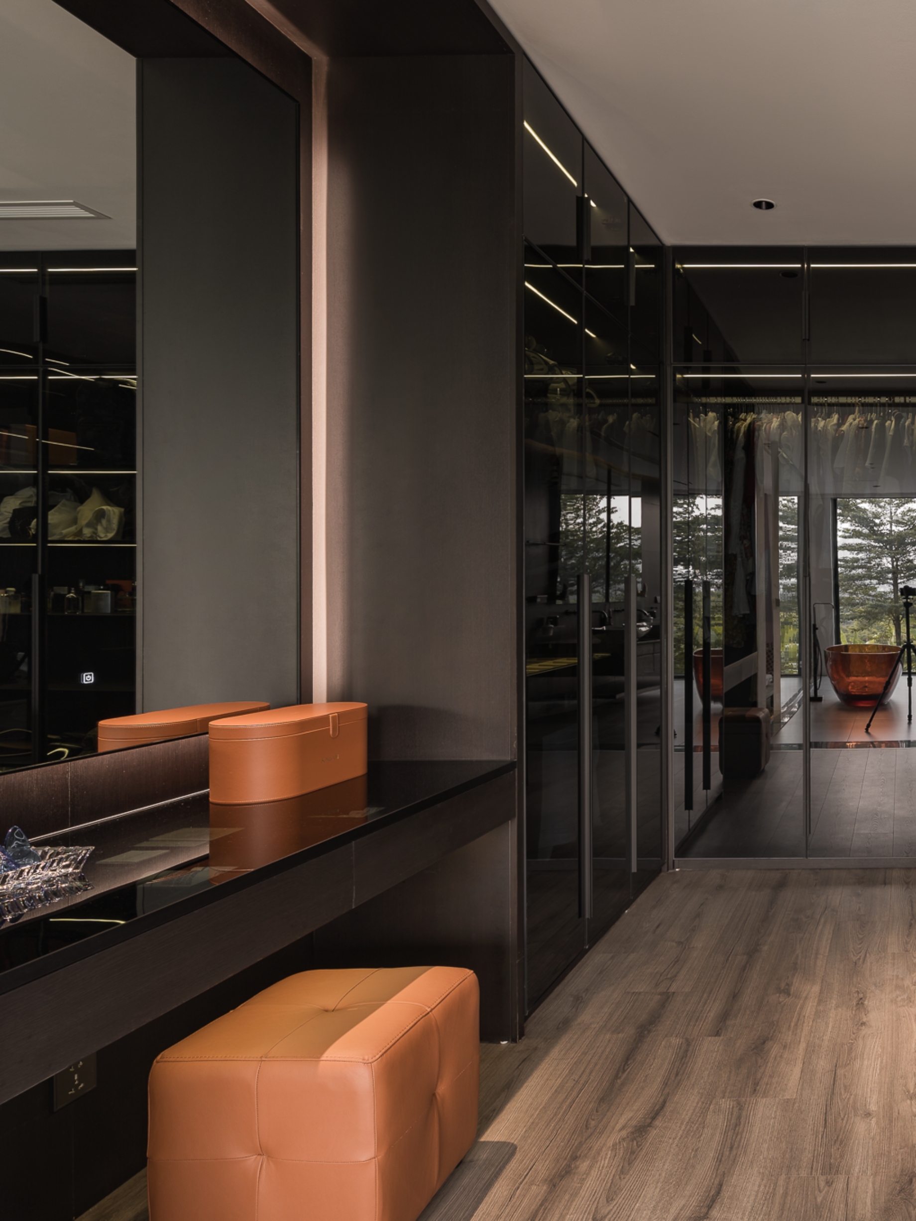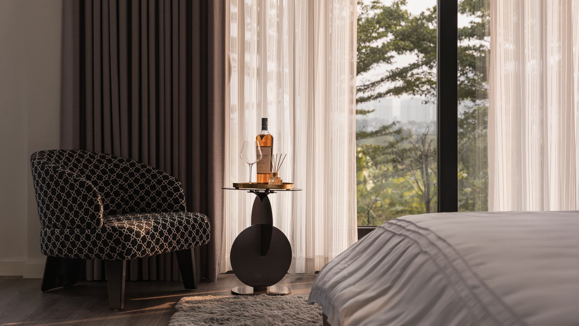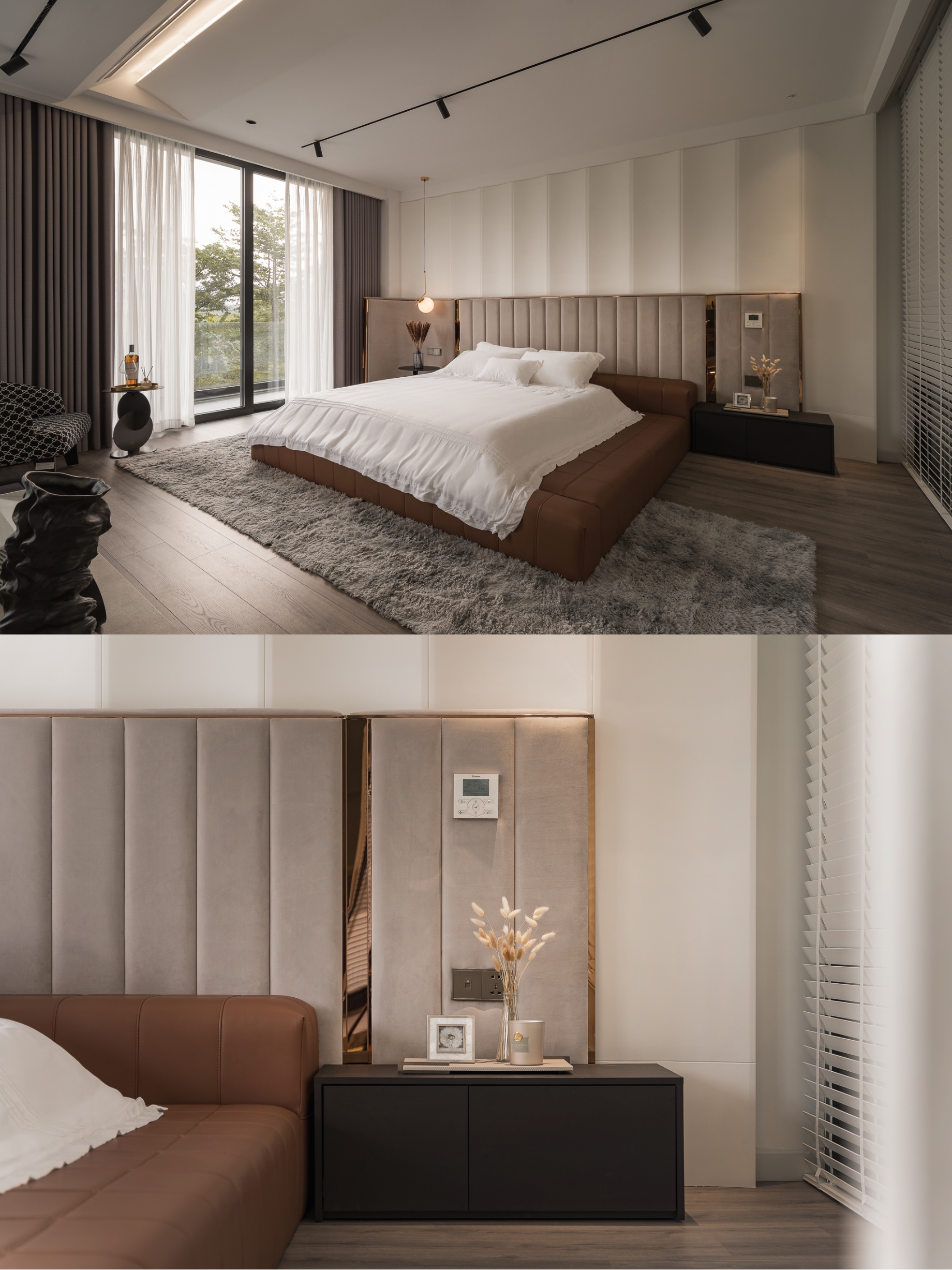 Không gian sinh hoạt chung được xử lý với tông ghi – đen làm chủ đạo, điểm xuyết bởi mặt bàn đá nâu vân ấm, cùng hệ sofa da rộng rãi tạo nên sự cân bằng giữa hiện đại và gần gũi. Phòng khách mở ra khung cửa kính lớn, đưa ánh sáng tự nhiên ùa vào, làm dịu bớt gam màu tối, đồng thời nhấn mạnh tính kết nối giữa nội thất và cảnh quan bên ngoài.