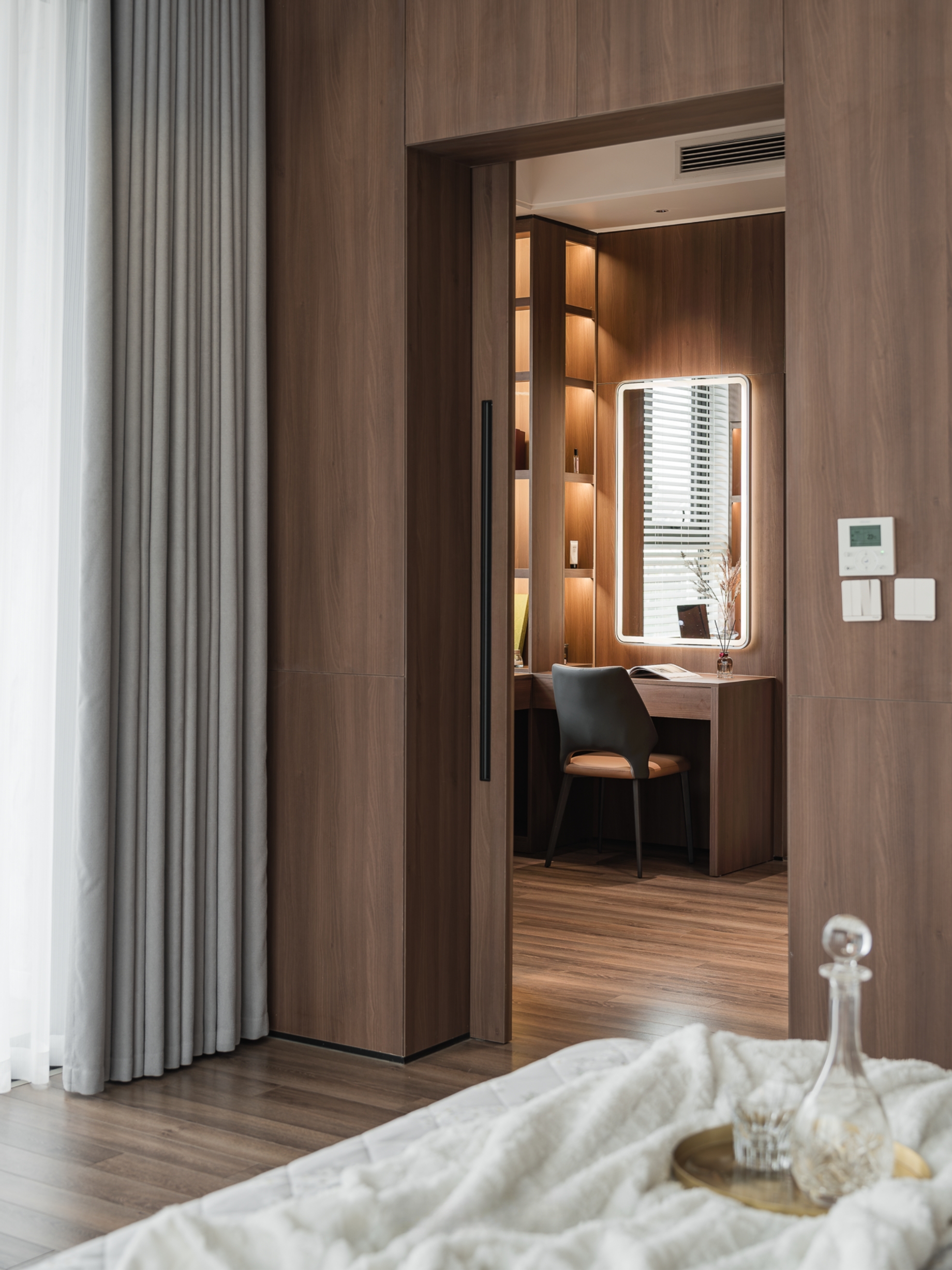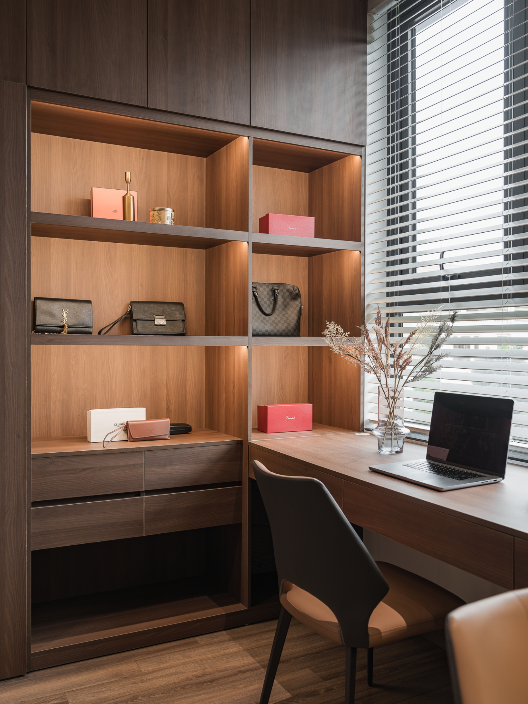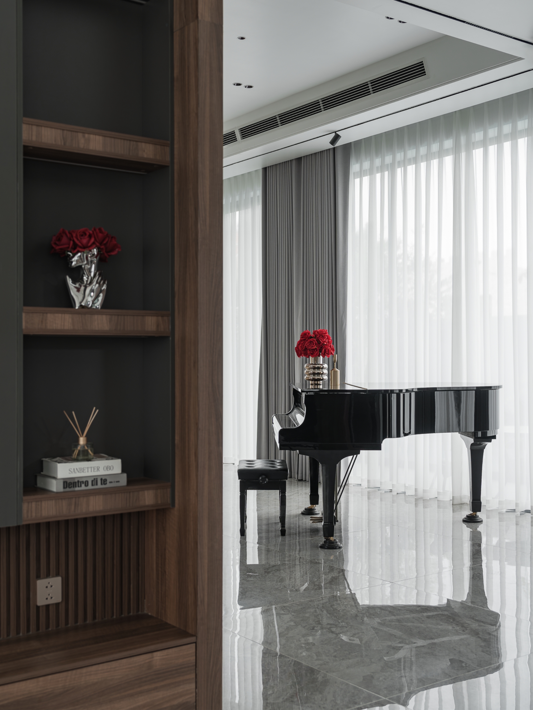 Nhưng phía sau vẻ ngoài nổi bật ấy, SENDESIGN chọn kể một câu chuyện hoàn toàn tương phản - một không gian sống tối giản, tĩnh tại và được dệt nên từ hai chất liệu chủ đạo: gỗ và đá tự nhiên.