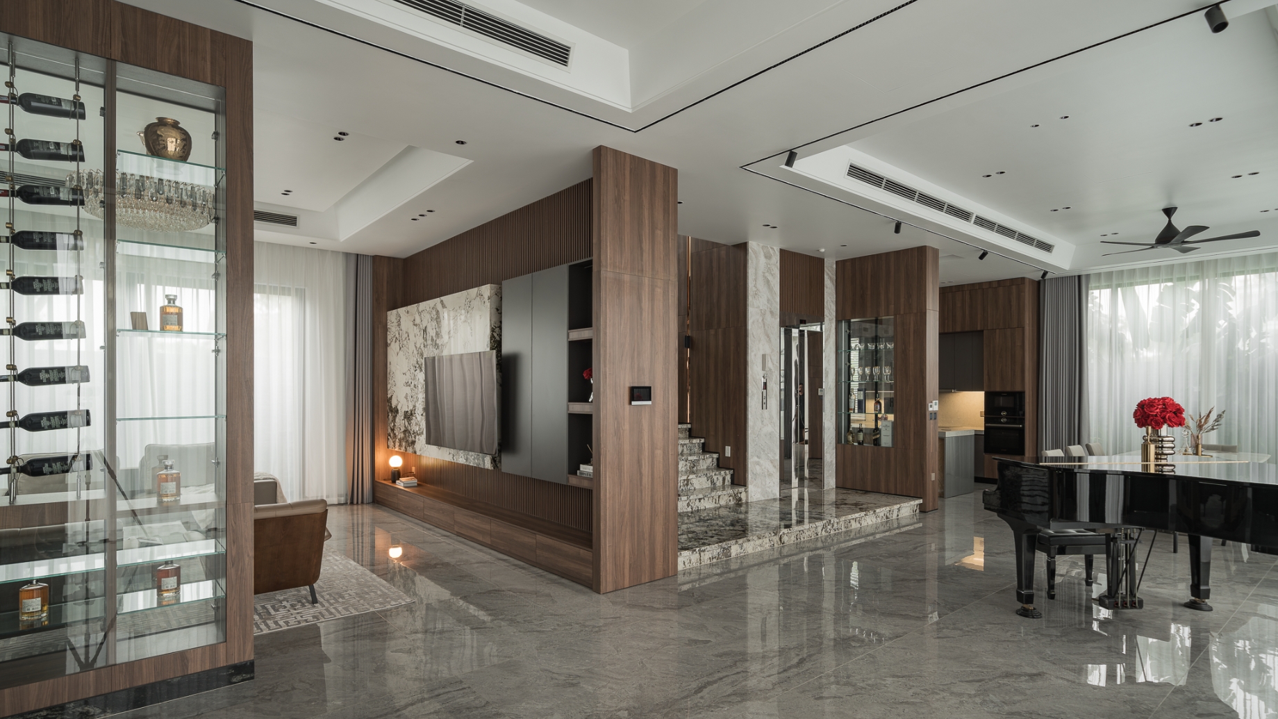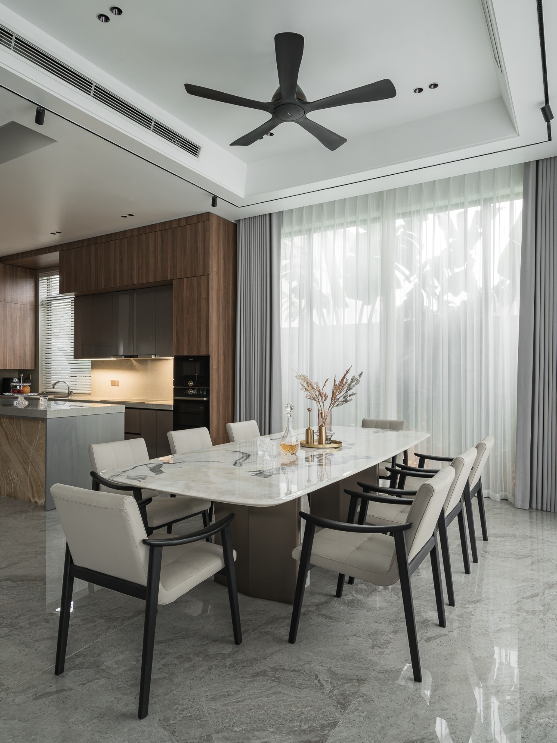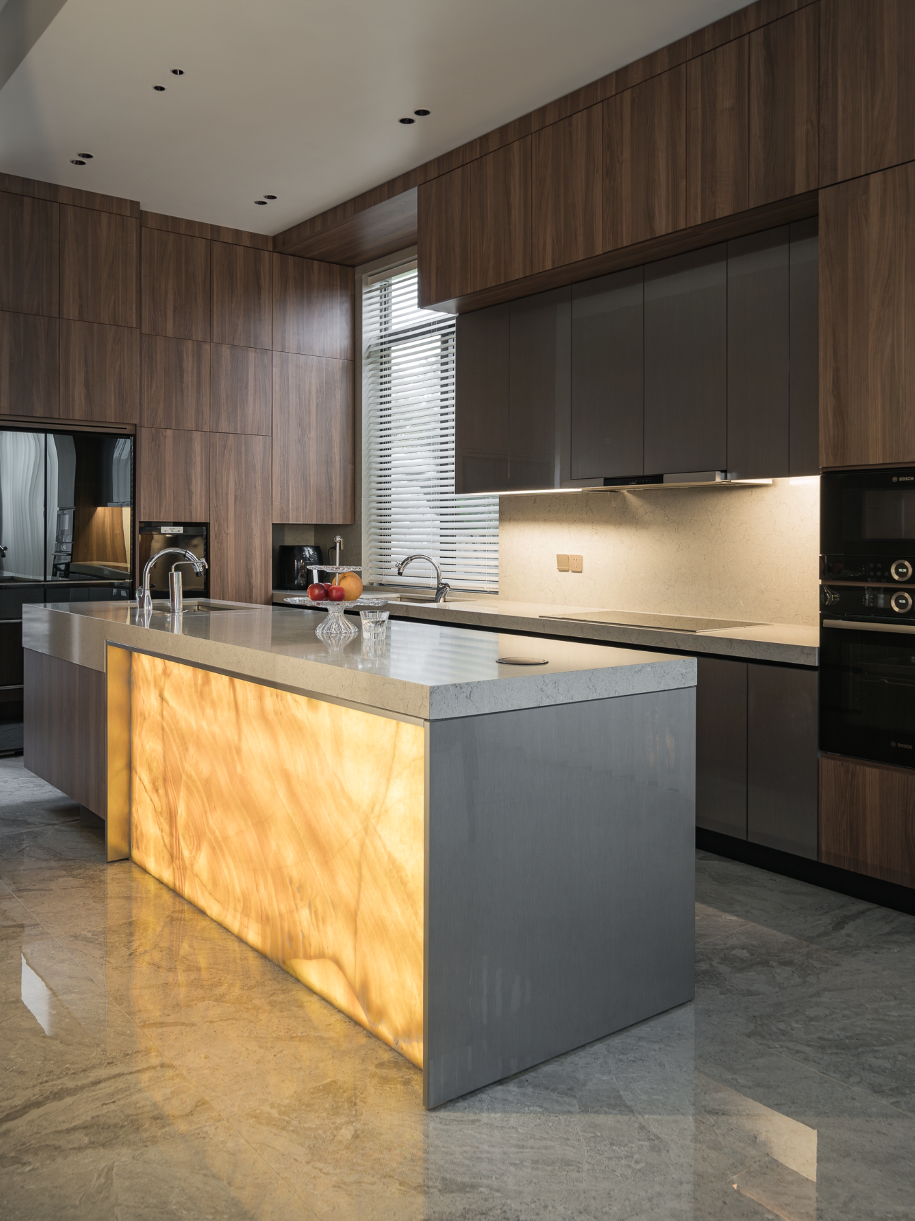 Bước vào bên trong, cảm giác đầu tiên là sự liền mạch. Đá tự nhiên với sắc độ trầm, vân mạnh mẽ chạy xuyên suốt từ sàn tới các diện tường lớn, tạo nên nền tảng bền vững và sang trọng cho toàn bộ căn nhà. Trên đó, gỗ óc chó được sử dụng tiết chế nhưng tinh tế, bao bọc khối bếp, hệ tủ và các chi tiết ốp, mang lại sự ấm áp cân bằng cho bầu không khí hiện đại.