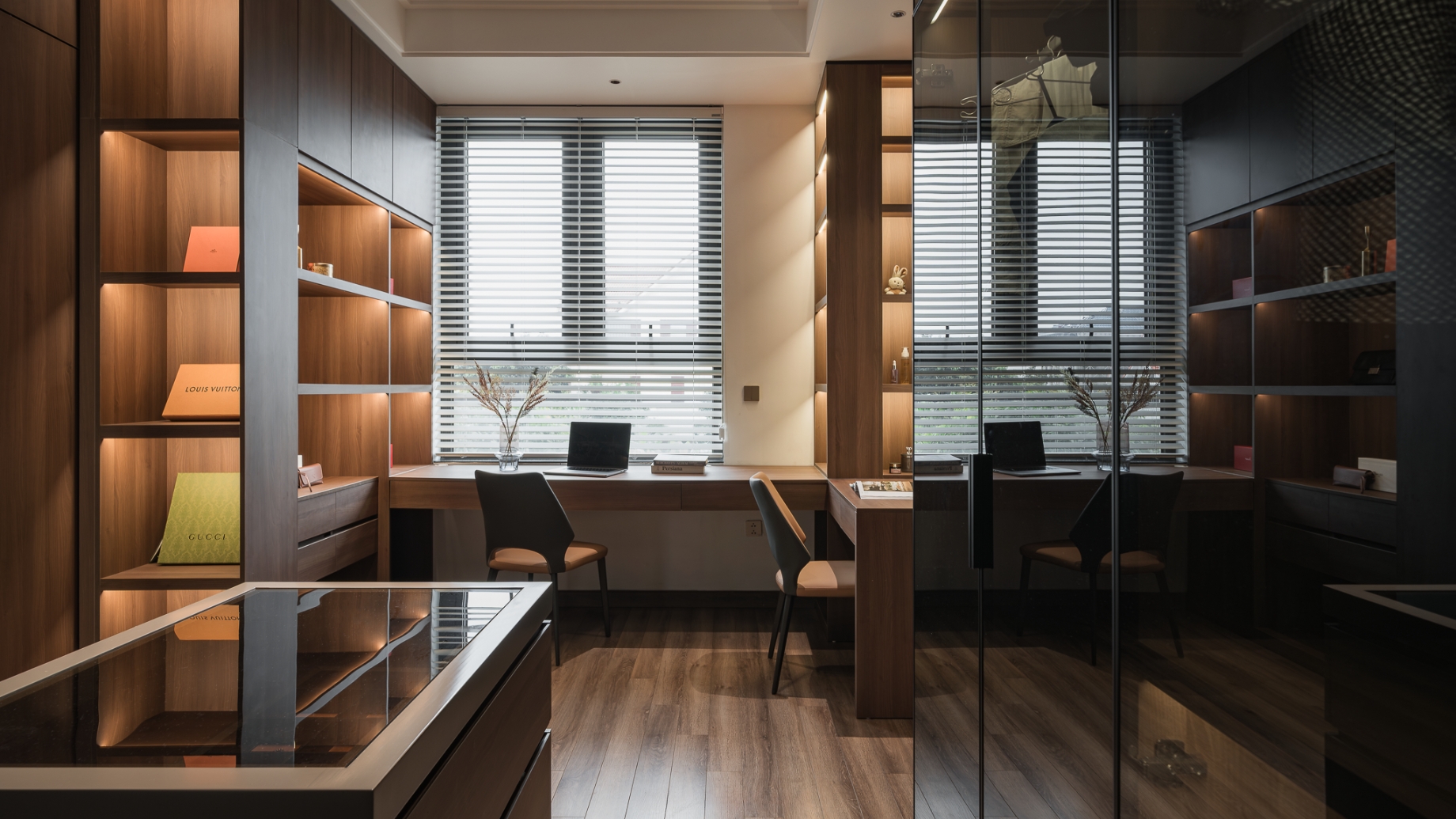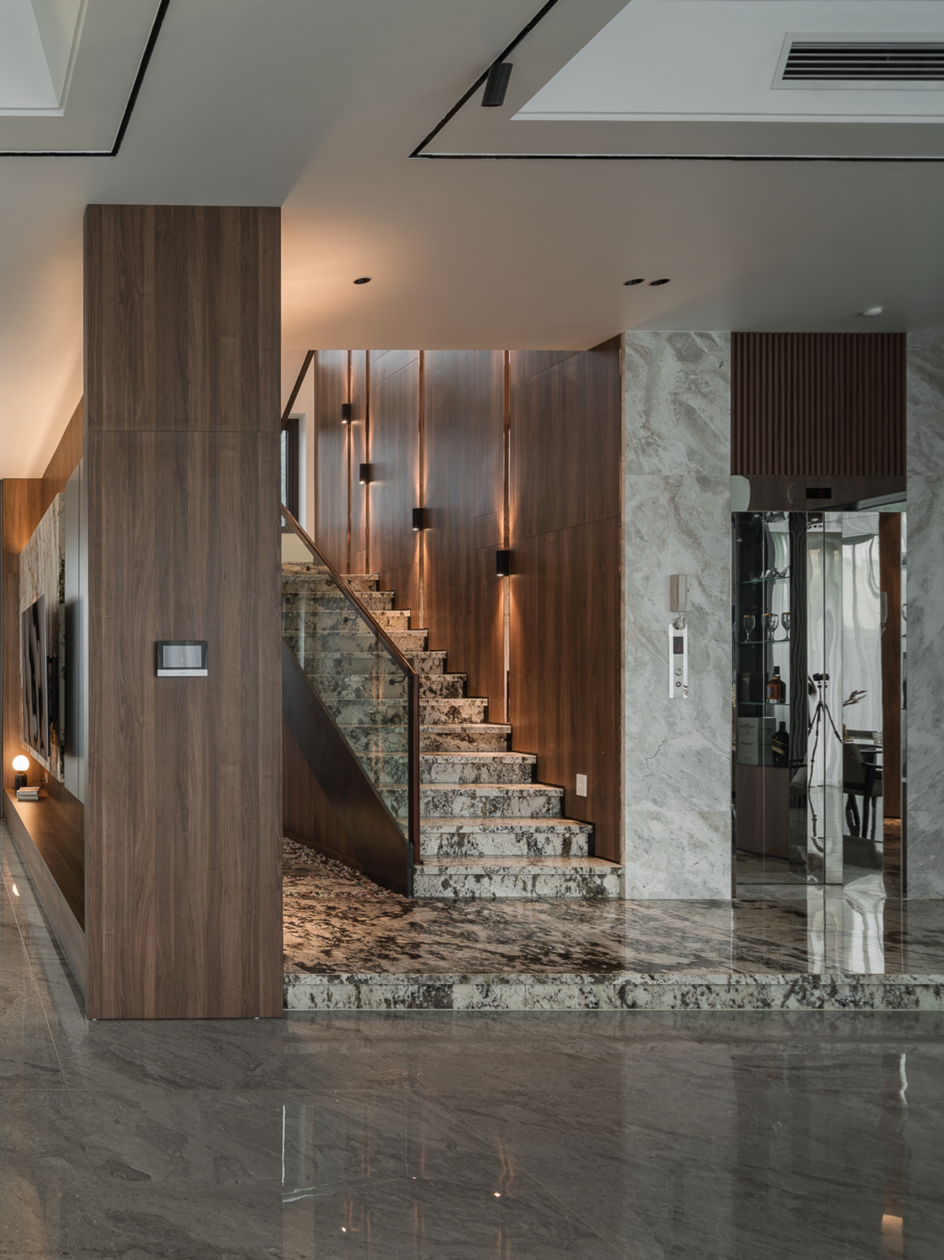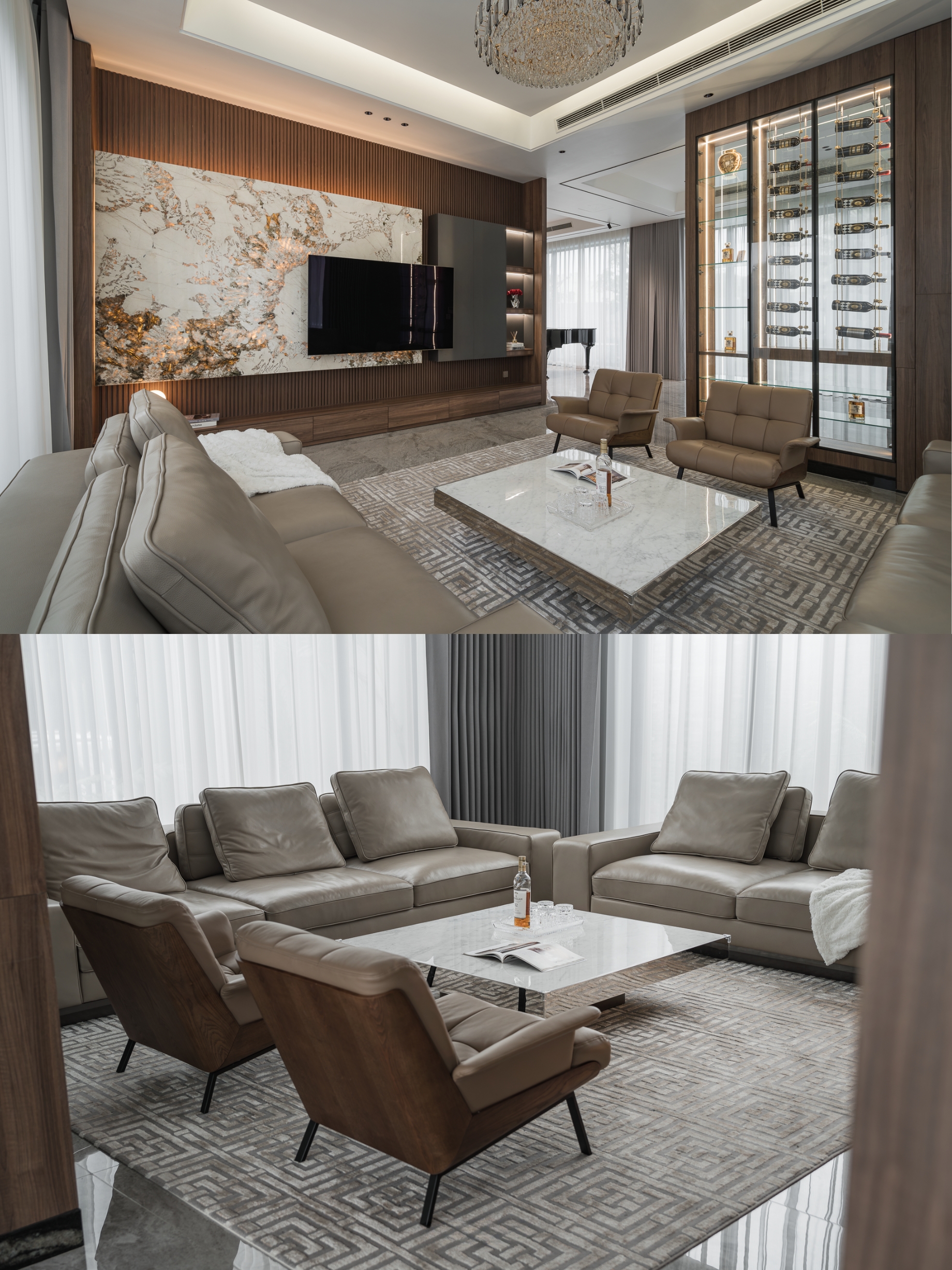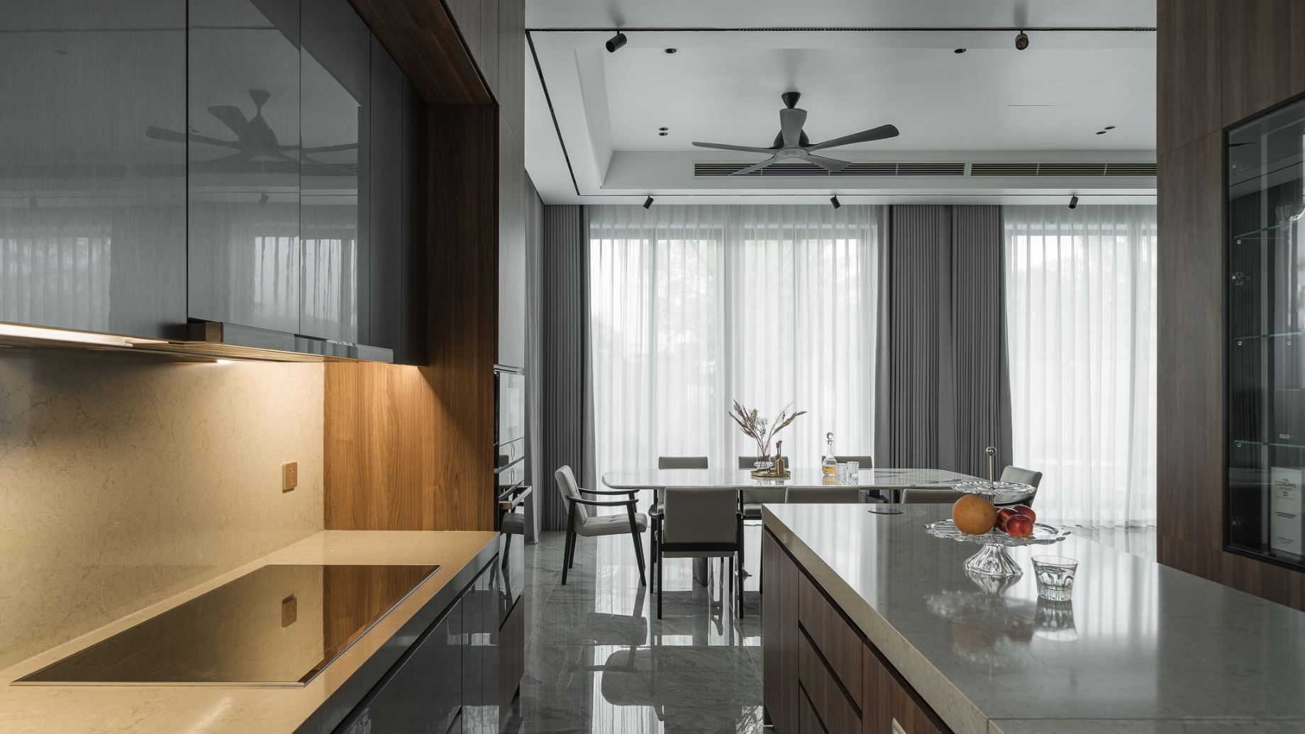 Bước vào bên trong, cảm giác đầu tiên là sự liền mạch. Đá tự nhiên với sắc độ trầm, vân mạnh mẽ chạy xuyên suốt từ sàn tới các diện tường lớn, tạo nên nền tảng bền vững và sang trọng cho toàn bộ căn nhà. Trên đó, gỗ óc chó được sử dụng tiết chế nhưng tinh tế, bao bọc khối bếp, hệ tủ và các chi tiết ốp, mang lại sự ấm áp cân bằng cho bầu không khí hiện đại.