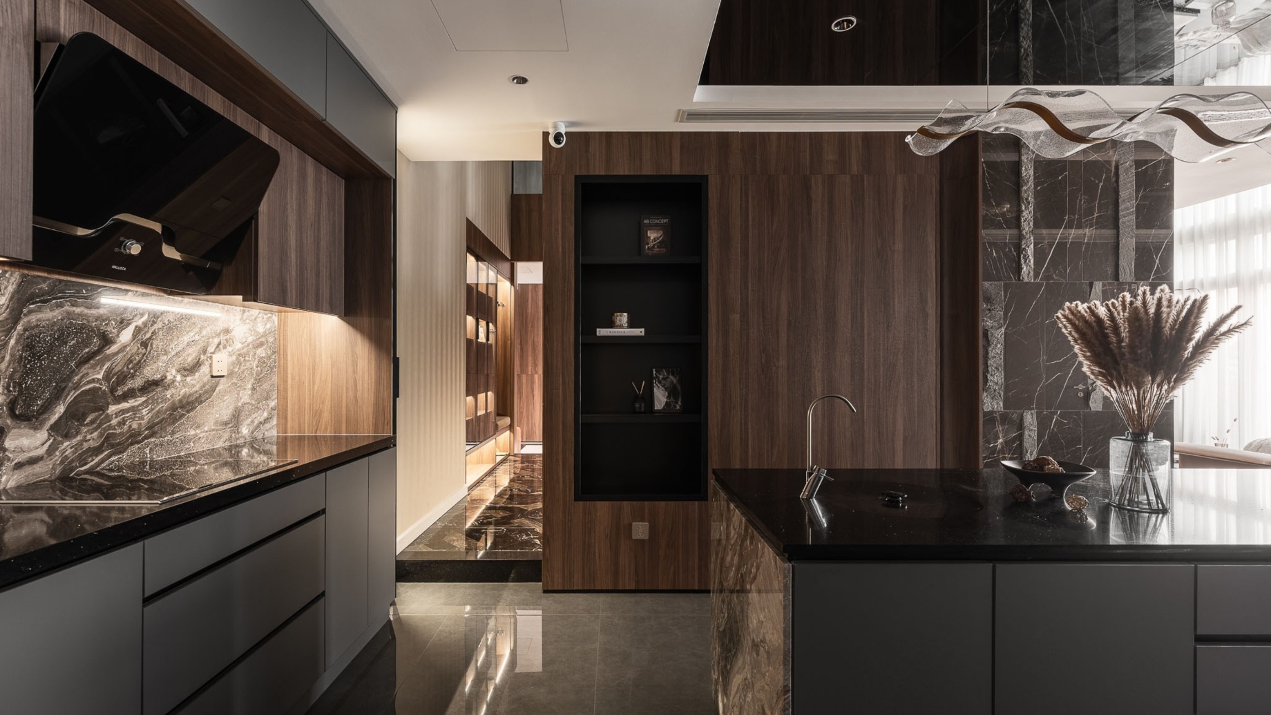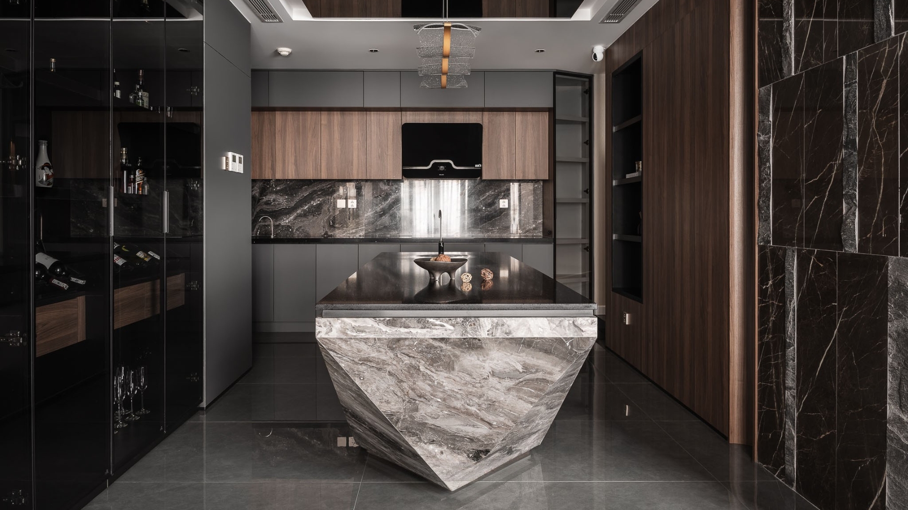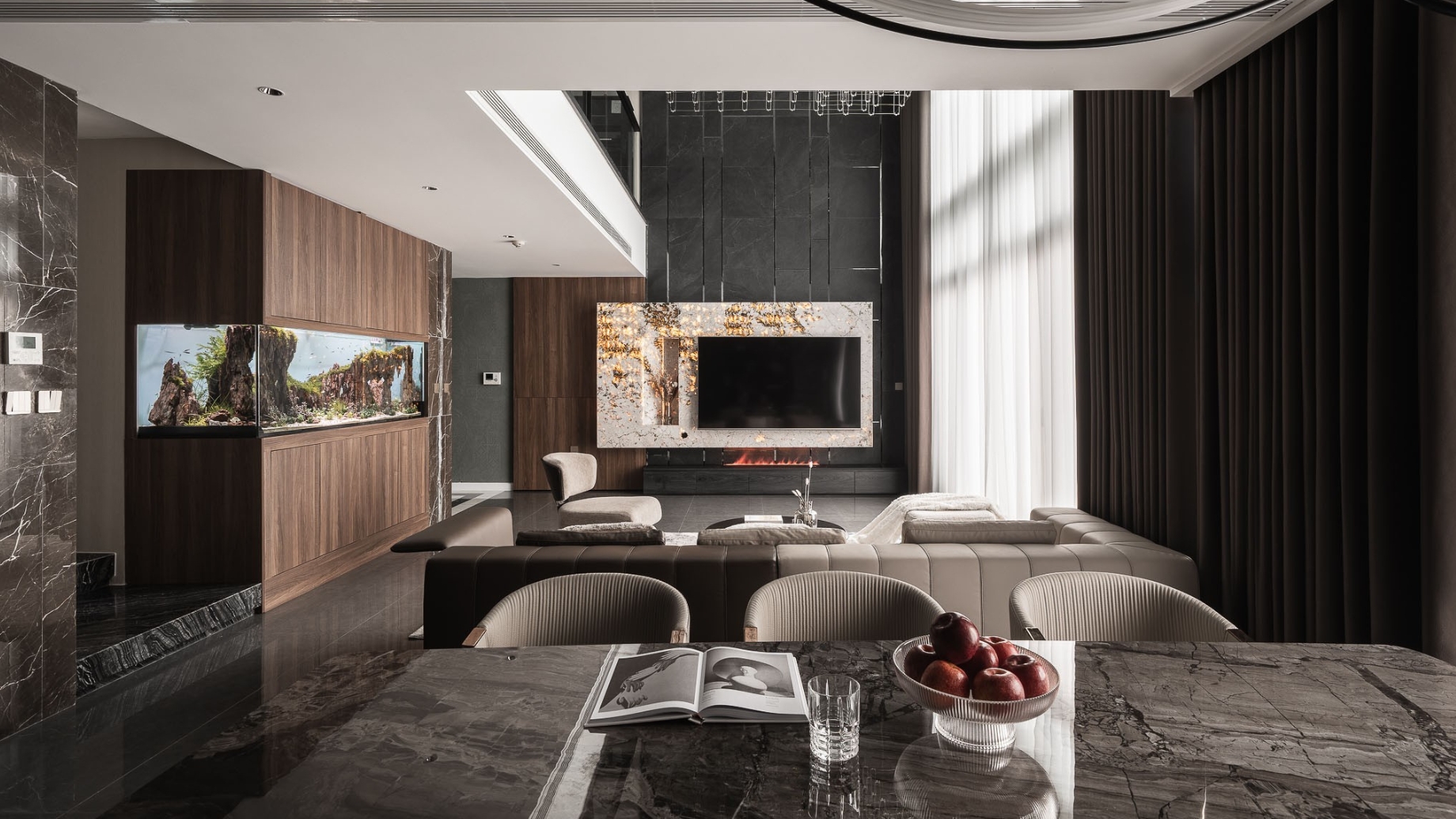 SENDESIGN đã chọn ngôn ngữ tối giản nhưng mạnh mẽ - lấy vách tivi bằng đá xuyên sáng làm điểm nhấn cho căn nhà. Phía dưới, lò sưởi âm tường tạo hiệu ứng ánh sáng hắt lên, biến toàn bộ mặt đá thành hình ảnh ngọn lửa như bùng cháy. Ngọn lửa ấy còn ẩn dụ cho chính gia chủ - một con người mãnh liệt và tràn đầy đam mê trong công việc và cả cuộc sống.