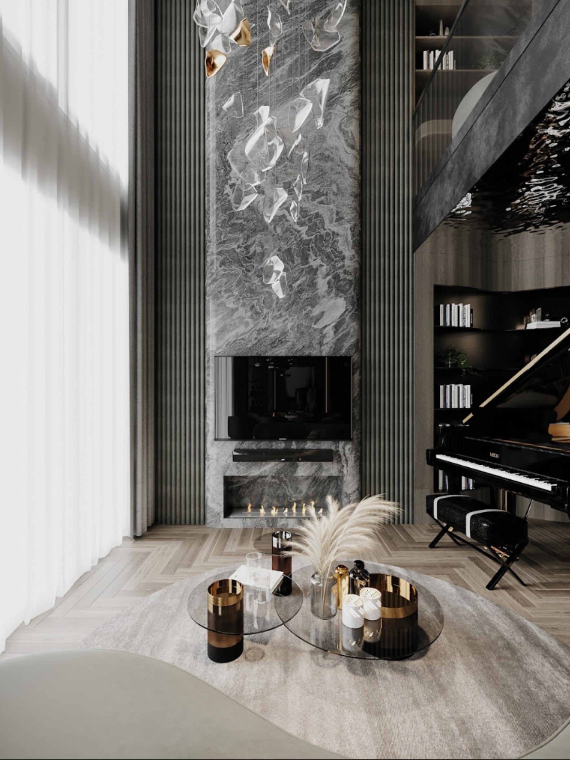 Trần nhà được xử lý như một chuyển động mềm, với hiệu ứng kim loại lỏng phản chiếu ánh sáng một cách tiết chế, mở rộng không gian mà không phô trương. Trong tổng thể ấy, cầu thang xoắn ốc đen vươn lên như một nét phác thảo dứt khoát, còn cây đàn piano đen bóng đặt ở trung tâm trở thành điểm dừng cảm xúc - nơi cổ điển và đương đại gặp nhau trong trạng thái cân bằng tự nhiên.