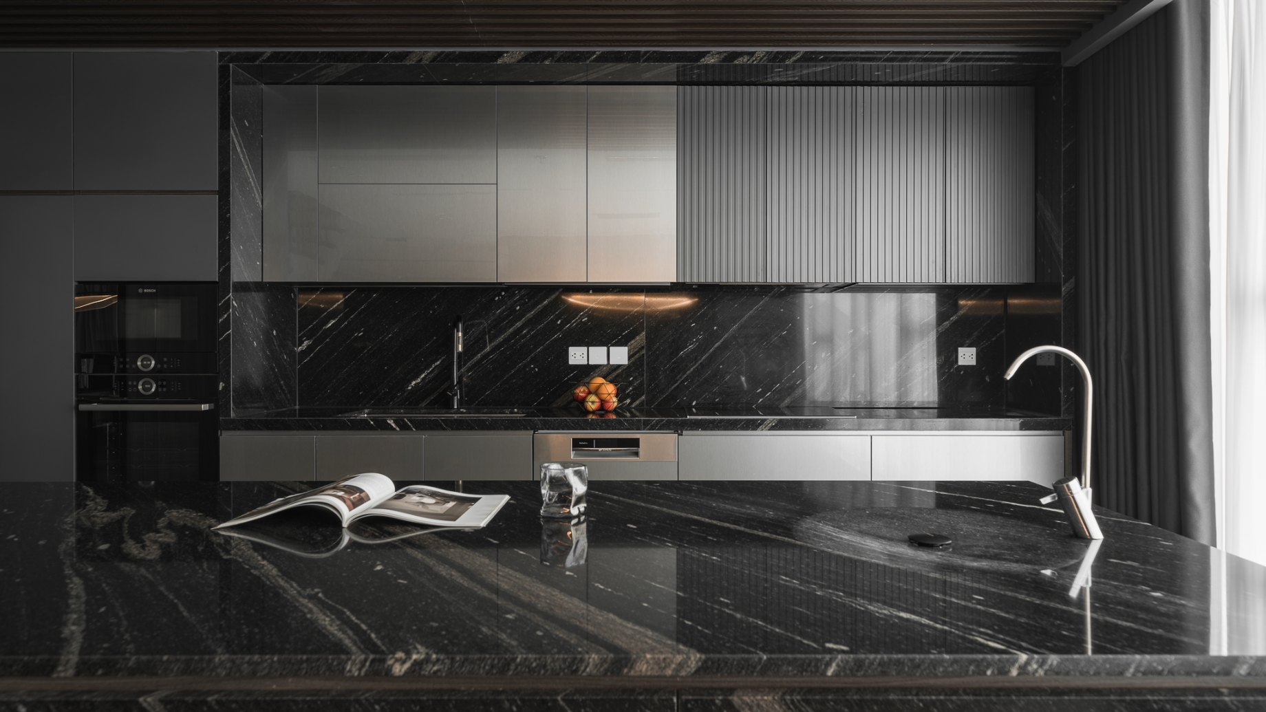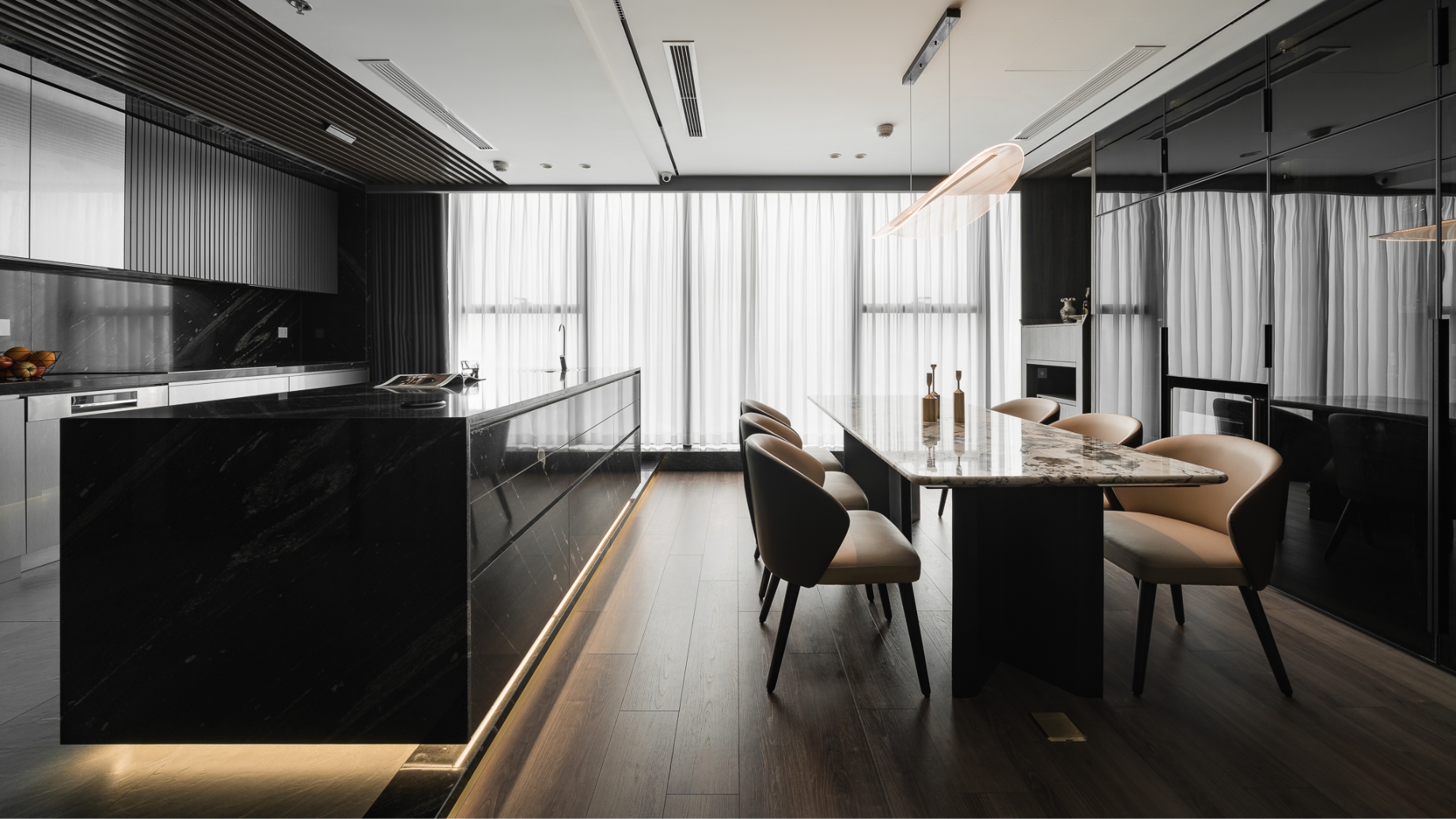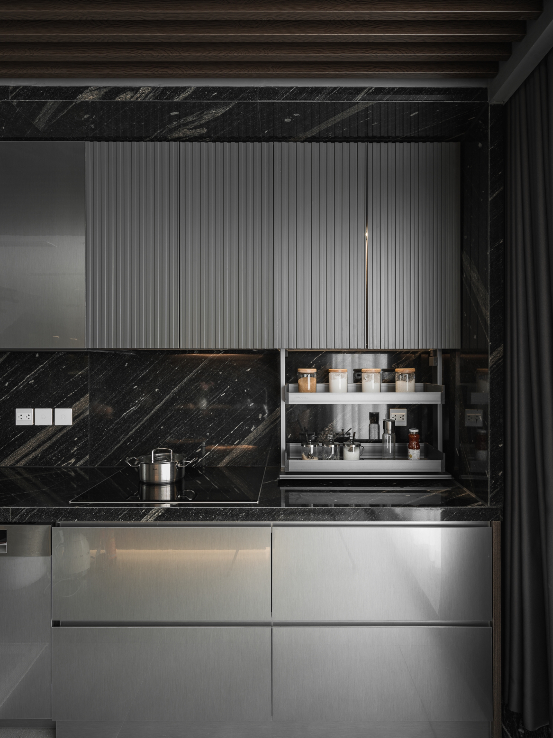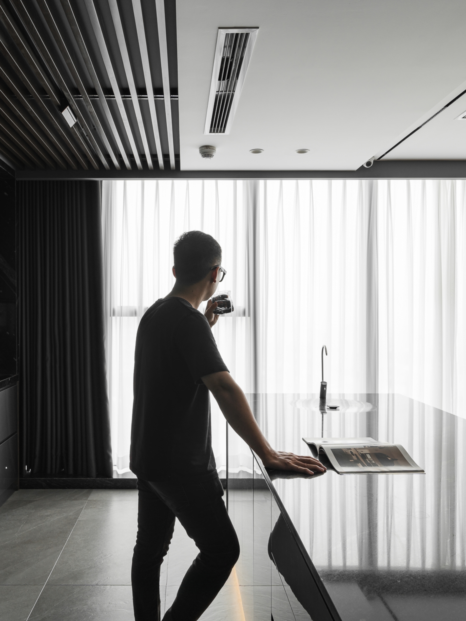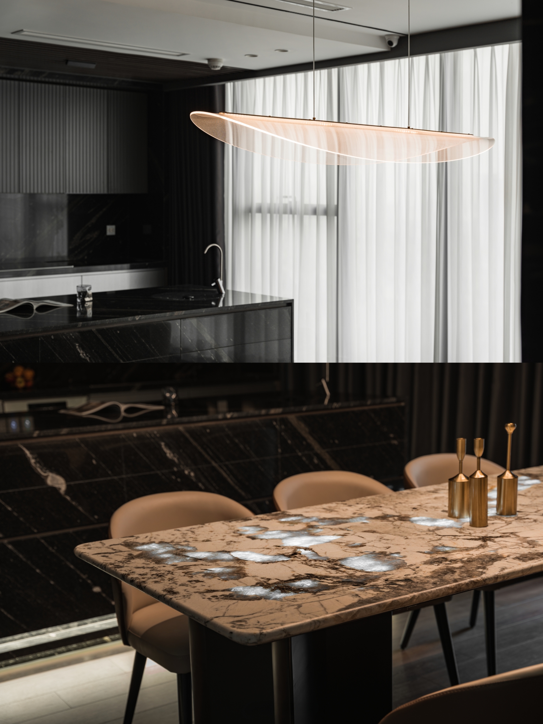 Anh là người chồng trầm tĩnh, chọn cách đứng sau quan sát và tin tưởng vợ đưa ra quyết định cuối cùng. Chị là người phụ nữ bản lĩnh, yêu cái đẹp và nhạy cảm với từng chi tiết. Chị mong muốn một không gian bếp không cầu kỳ nhưng nhất định phải có cá tính. Từ đó, chúng tôi chọn sự tinh giản với quầy đảo bay ở trung tâm với bề mặt đá sắc lạnh kết hợp với chút ánh sáng dịu dàng.